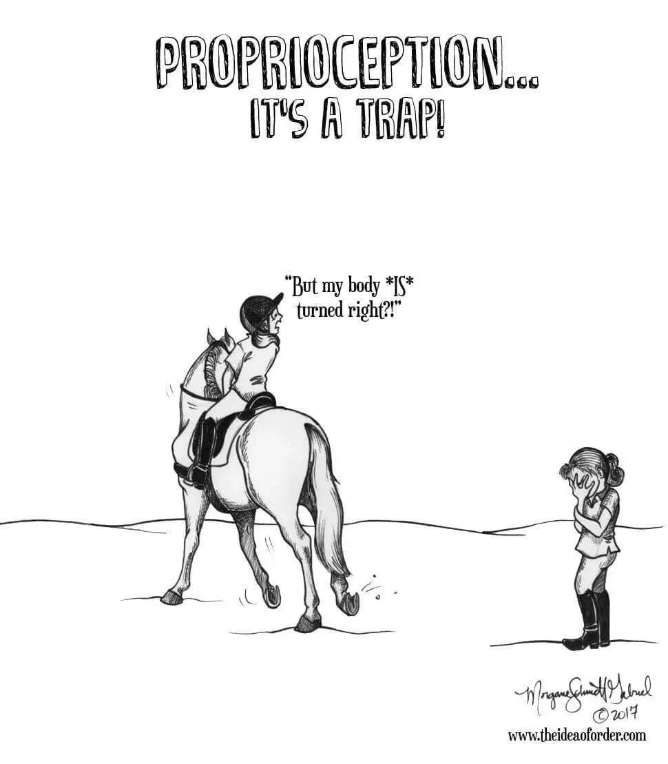 You may struggle to perform certain riding movements. And feel your proprioception (perception or awareness of the position and movement of the body) is playing tricks on you. Your trainer is trying to help you, but when you attempt to place yourself where your trainer instructs it feels like you're in outer space, you can’t connect with this area or maintain it. And quite frankly, wonder if your trainer is actually looking at you!