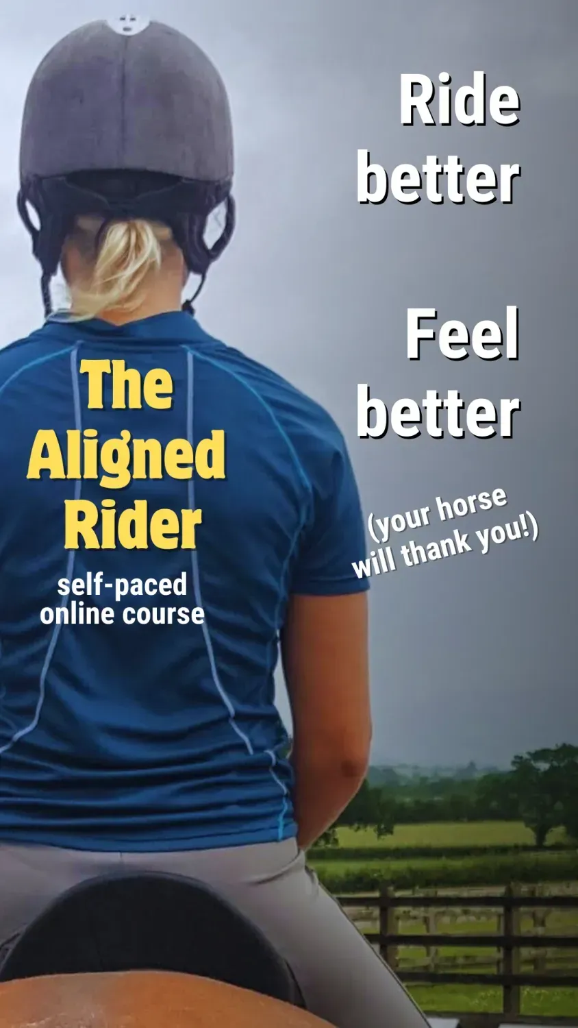 Enjoy this blog? Would you like to transform your riding position, balance, and body awareness and help your body and horse by restoring your alignment? Join me on my “Aligned Rider” course, as I guide you through easy-to-use strategies, and transformative insights which take very little time to sprinkle into your day.